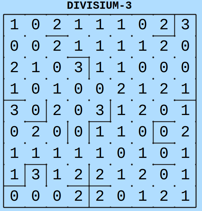 Pelin idea lyhyesti: jaa ruudukko täsmälleen 3 ruudun kokoisiin alueisiin, joiden sisältämien lukujen summa on 3. Ratkaisu on yksikäsitteinen, eli pulman voi ratkaista vain yhdesllä tavalla.