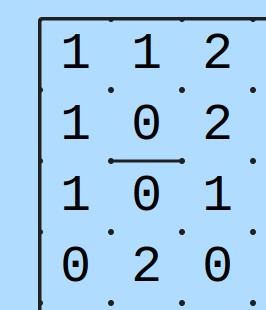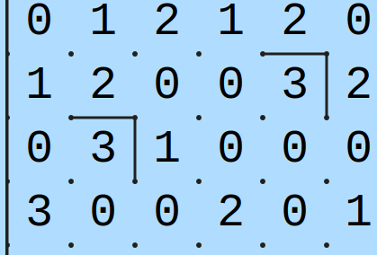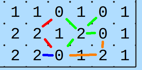 - Vasemmasta alareunasta laskettuna ensimmäinen 2 on pakko muodostaa ryhmä [0,1,2]. Tästä taas seuraa, että sen yläpuolella oleva 2 on mahdollista kytkeä vain yhteen 0:aan ja näiden kahden väliin jäävään lukuun 1.
