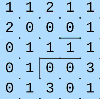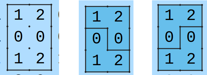 - Oikeassa laidassa olevan “Nollatornin” toiseksi alimmainen 0: Tämän voisi kytkeä [0,1,2]-ryhmään kahdella tavalla. Kuitenkin nähdään, että jos tämä kytketään oikean reunan kakkoseen, yksinäinen 0 jää jumiin, kun se on jo valmiiksi kolmen muun seinän sisällä. Tällöin aikaisemmin mainittu 0 onkin pakko kytkeä vasemmalla alaviistossa olevaan kakkoseen.