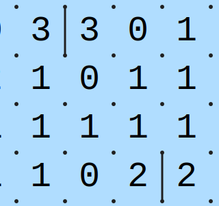 Edellisen tarkennukseksi, seuraavassa kuvassa on myös sama tilanne. Vaikka kolmonen onkin lähistöllä, kuvassa erotettujen nollien vasemmalla puolella oleva nolla ei voi kuulua minkään kolmosen kanssa samaan ryhmään. Täten se ei voi kuulua toisen nollakaan kanssa (Sääntö 1), eli näiden välissä on varmasti viiva.
